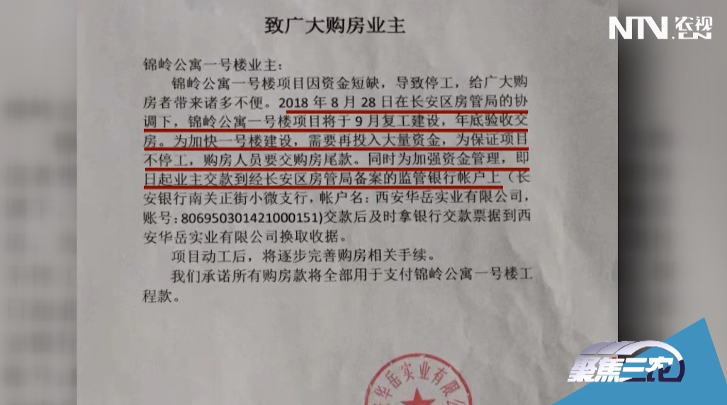 当时,按照会议要求由开发商发出一份通知。通知强调:2018年8月28日,在长安区房管局的协调下,锦岭公寓一号楼项目将于9月复工建设,年底验收交房。为加快一号楼建设,需要再投入大量资金,为保证项目不停工,购房人员要缴纳购房尾款。同时,为加强资金管理,业主缴纳的款项全部汇入长安区房管局备案的监管银行帐户。