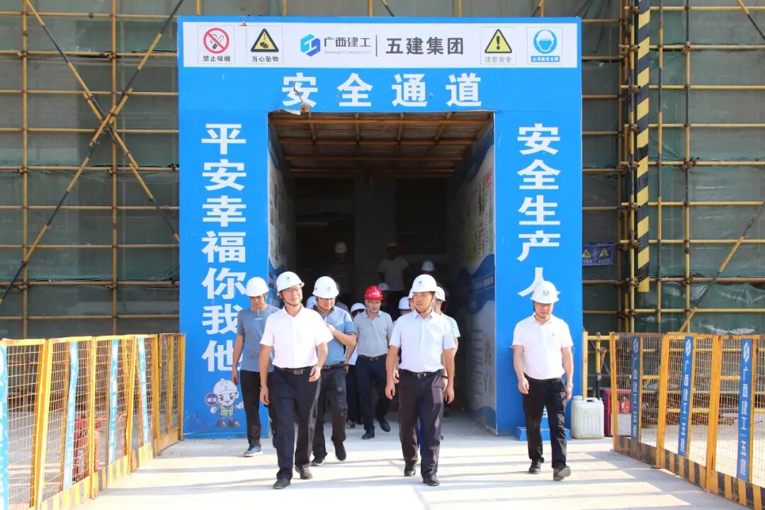 9月28日,在广西融安农村商业银行股份有限公司新建综合业务大楼项目施工现场,县委书记陈文敏(右二)开展安全检查。(蒋阳阳 摄)