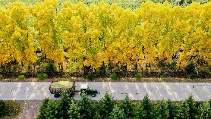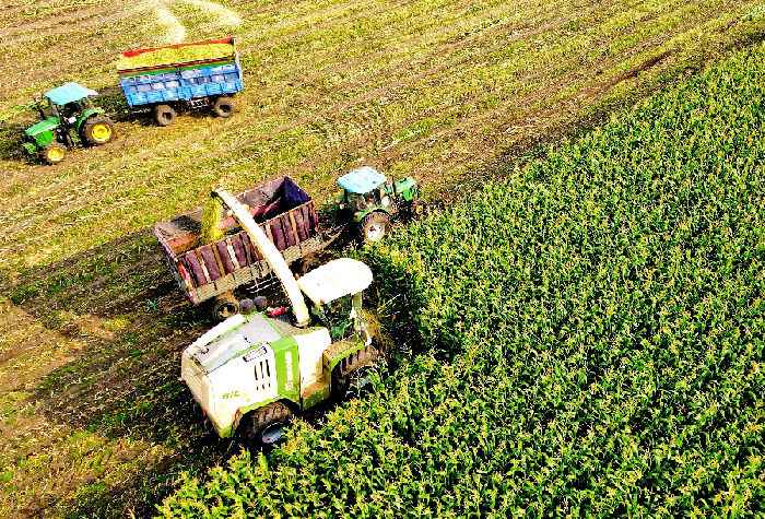 北大荒集团北安分公司赵光农场有限公司的青贮玉米已经迎来收获,拉开了当地旱田收获序幕。一辆辆收获机车前进着将整片玉米“吃”进去,连秸秆带玉米棒一起粉碎后再“吐”出来,旁边的运输车辆紧紧跟随,一车装满后,新鲜的青贮玉米被直接运往养殖场入窖压实储藏。