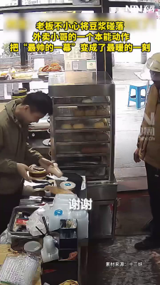 老板不小心将豆浆碰落,外卖小哥的一个本能动作,把“…