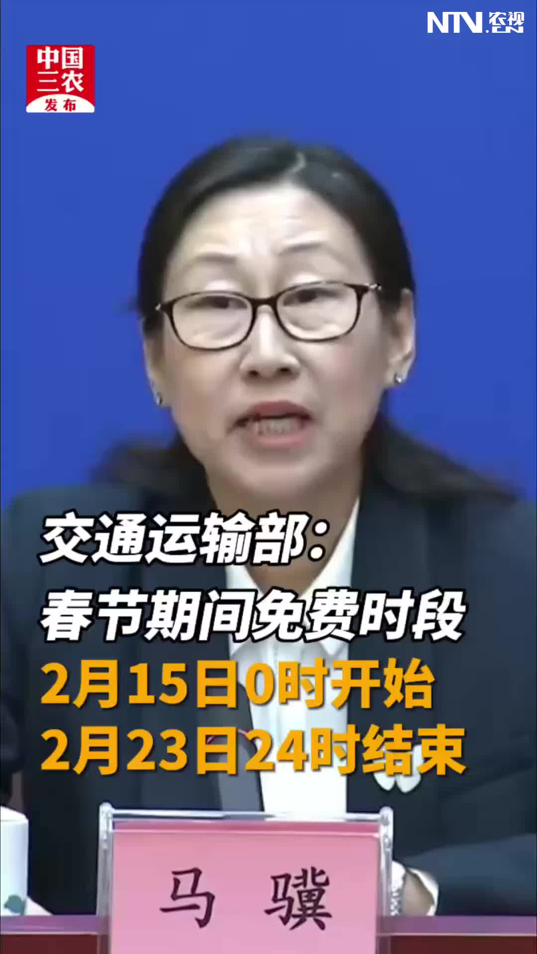 交通运输部:春节期间免费时段2月15日0时开始2月…