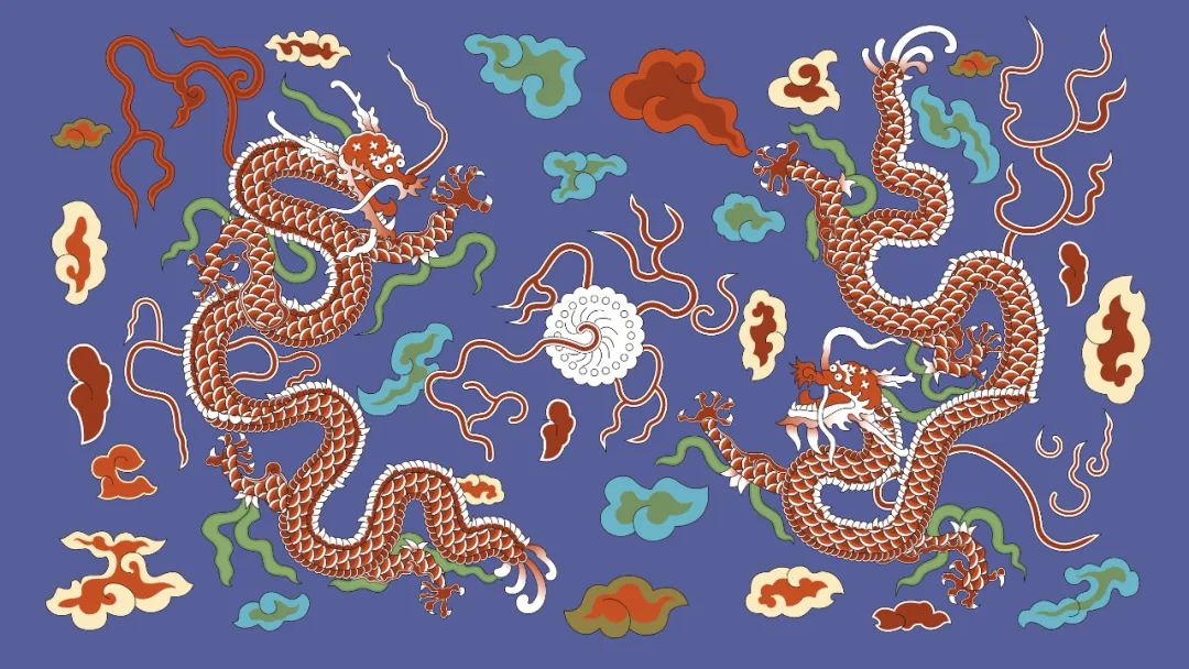 (清)畅音阁彩绘升降龙火焰宝珠藻井上的双龙戏珠纹(临摹设计图)