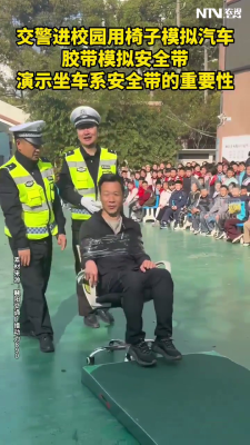 交警进校园用椅子模拟汽车,胶带模拟安全带,演示坐车…
