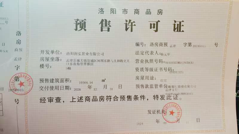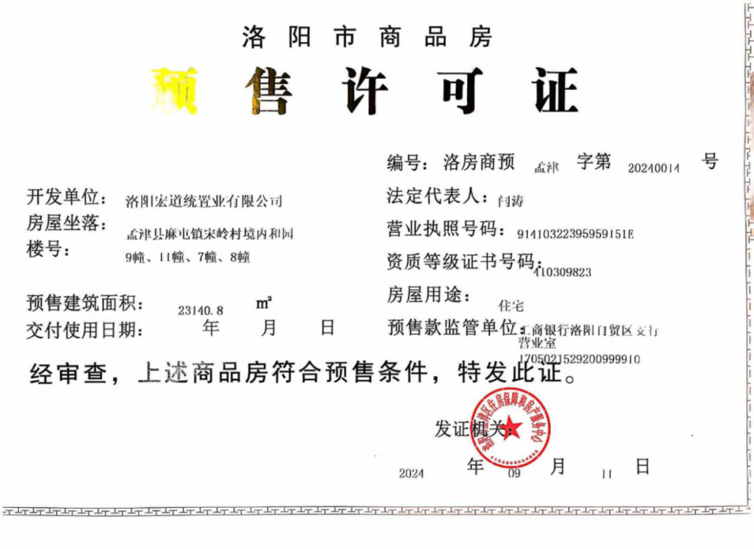和园项目位于孟津区麻屯镇宋岭村境内,由洛阳宏道通置业有限公司开发建设,预售证号:洛房商预(孟津)字第20240014号,准予预售建筑面积23140.8平方米,4栋楼均为18层共198套房源,房屋用途为住宅,发证日期为2024年9月11日。