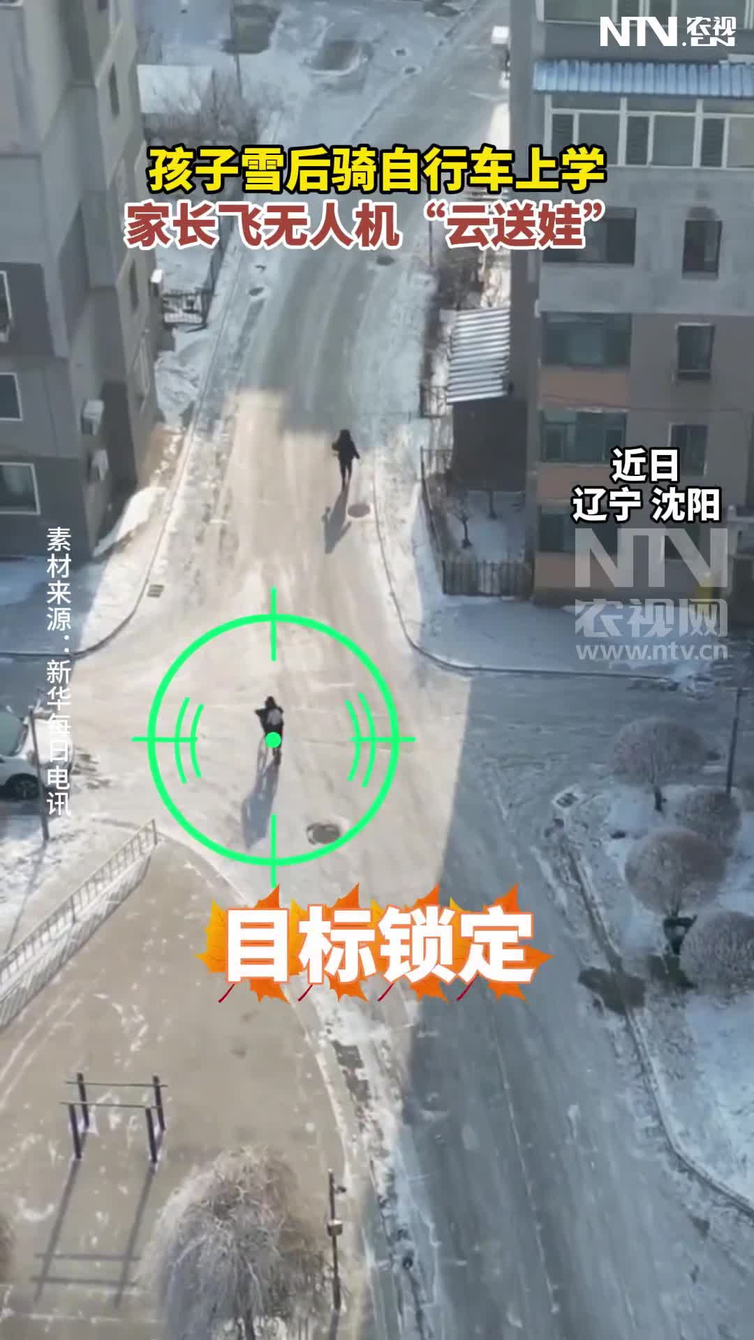 孩子雪后骑自行车上学,#家长飞无人机“云送娃”