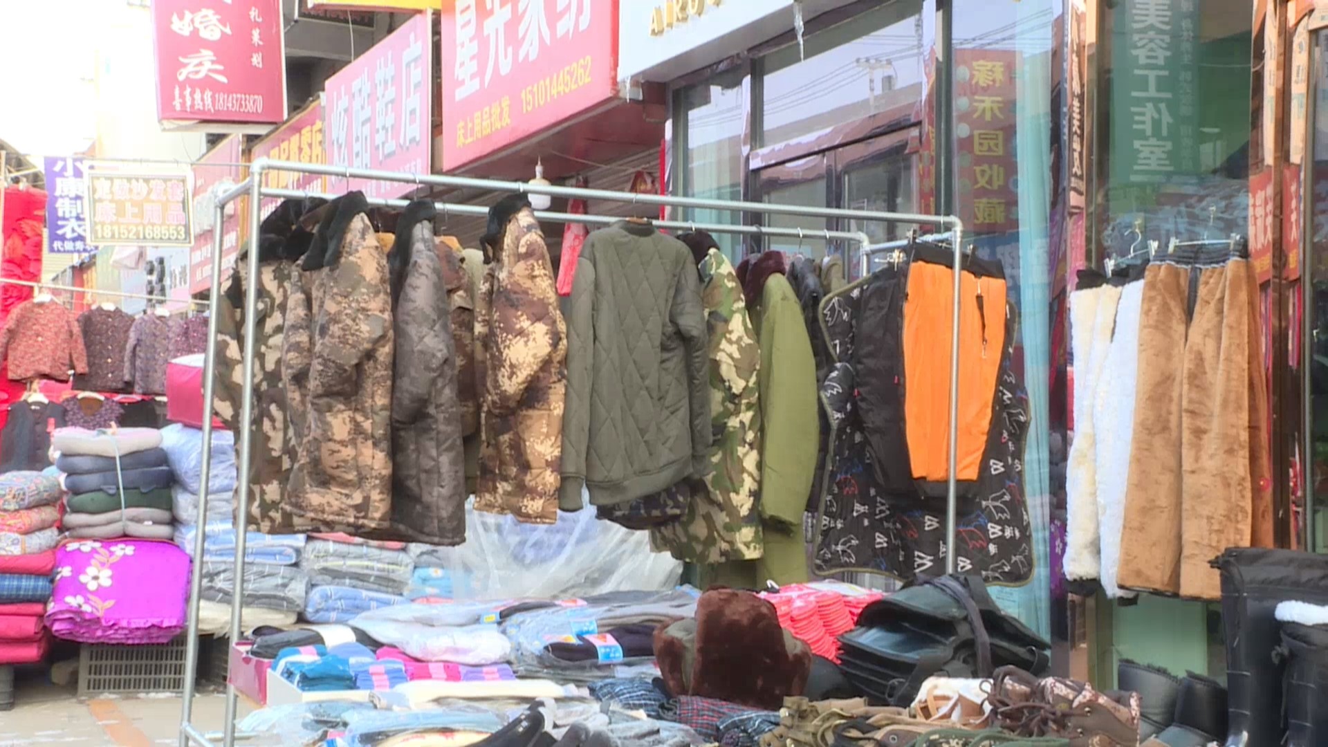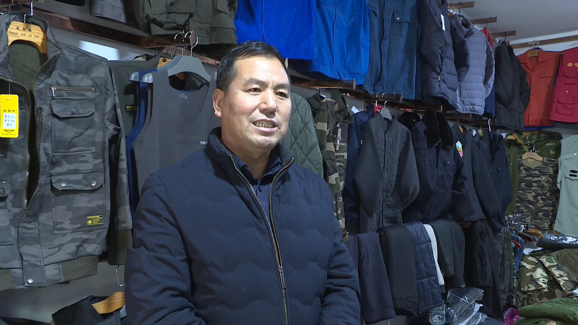 劳保店店主 张殿全:最近由于天气变冷,买的比较火的产品是军大衣,由于性价比比较高,适合各个年龄段,现在年轻人穿的也比较多。