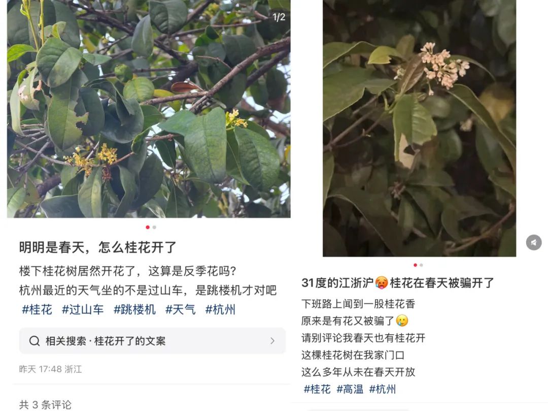 虽然春季通常不是桂花的主花期,但若是气候温和且土壤水分充足,也有可能会出现一些零星的开花现象,特别是在南方气候温暖的地区。春天早晚温差大,以及近期浙江的气候变化,恰好为桂花提供了合适的开花条件。这两天,杭州最高气温甚至飙到了30℃以上。但这场春日花事注定短暂。随着冷空气南下,3月末将迎来“气温跳水”,一些地区最低温将跌破10℃。王士臻表示,“若温度大幅下降,桂花可能会落下。”