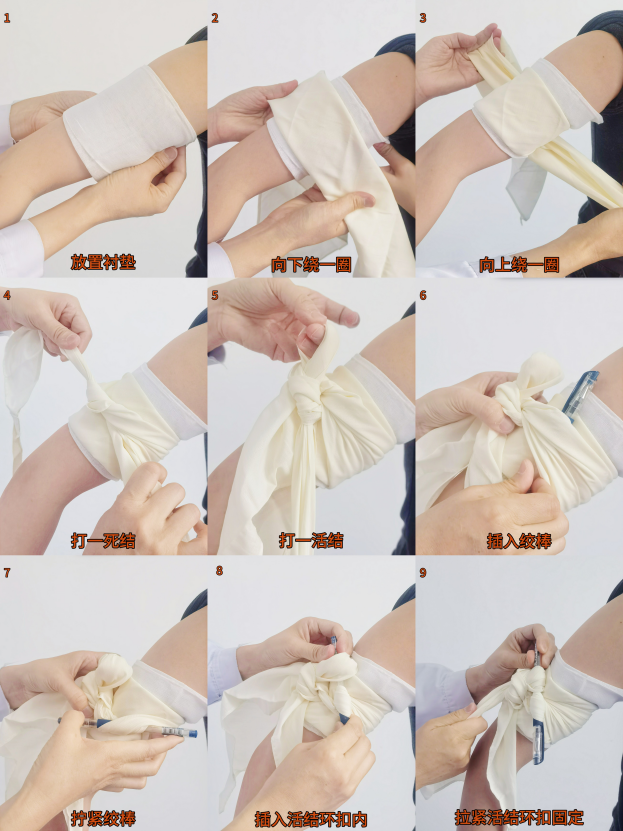切记,不可选用尼龙绳、铁丝及充电线等没有弹性的物品。这些物品不仅难以起到止血作用,而且容易造成肢体远端坏死。