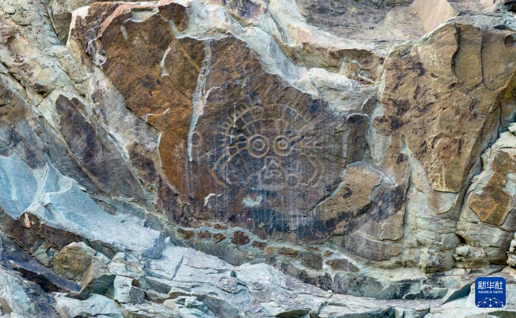 这是7月23日拍摄的贺兰山岩画景区内著名的标志性岩画“太阳神”(无人机照片)。