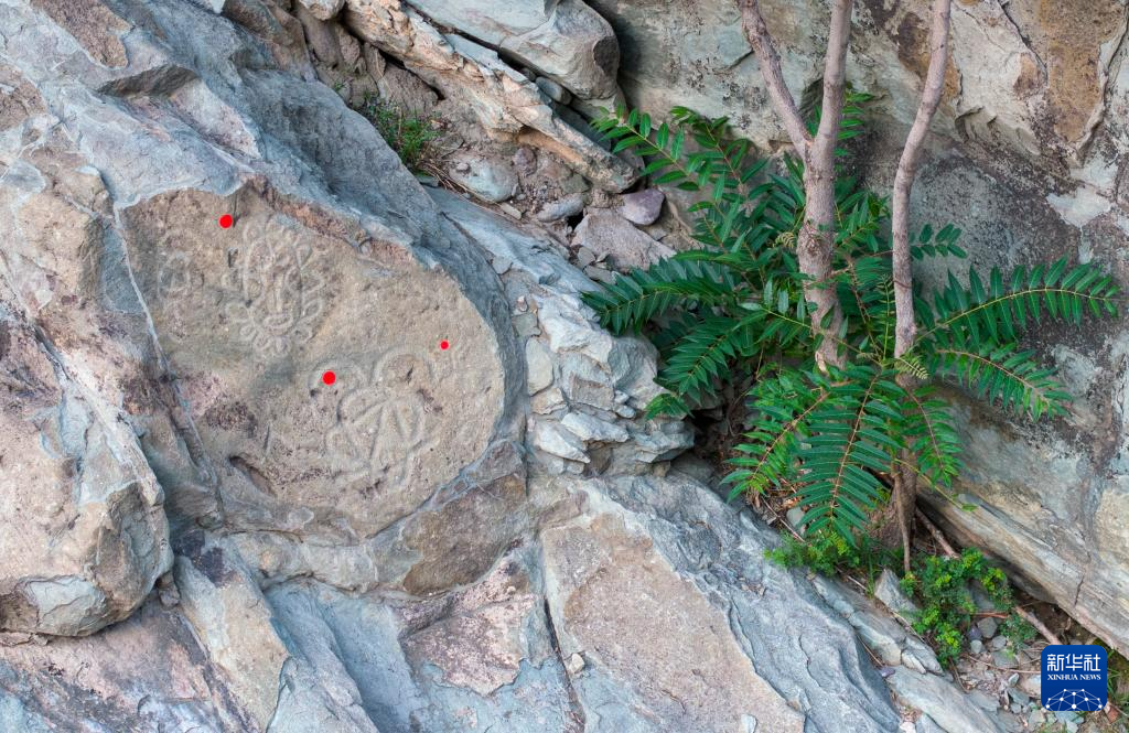 这是7月23日在贺兰山岩画景区拍摄的岩画和红色标识点(无人机照片)。标识点方便游客找到岩画,可以随时粘贴,对石质和文物不会产生影响。