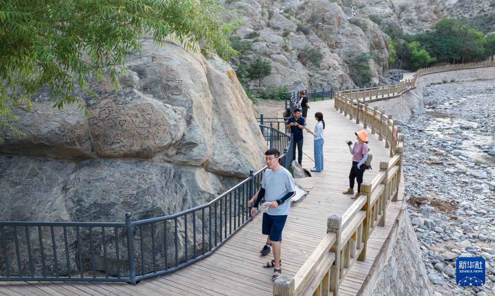 7月23日,游客在贺兰山岩画景区游览(无人机照片)。