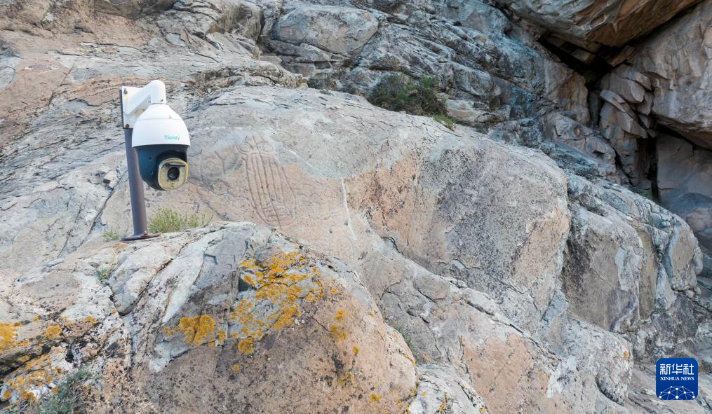 这是7月23日拍摄的贺兰山岩画景区的监控摄像头(无人机照片)。目前,贺兰山岩画景区内有100多个监控摄像头,对岩画情况进行监控。