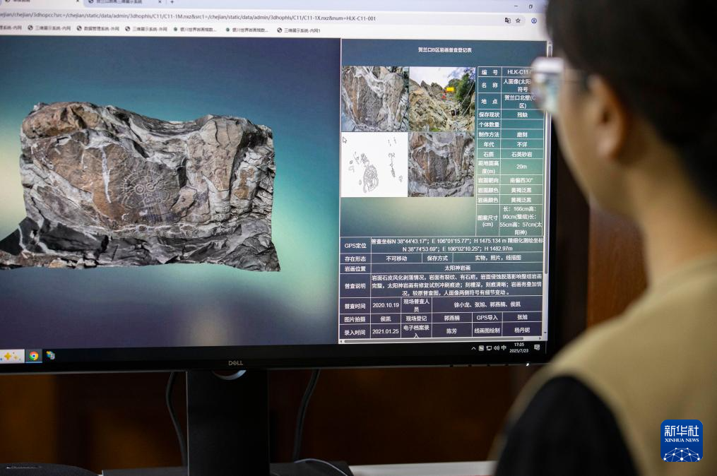 这是7月23日拍摄的贺兰山岩画多源数据管理平台。工作人员将贺兰口的形态和其中的岩画进行高精度扫描和建模,通过电脑便可查看贺兰口的整体情况和个体岩画样貌。
