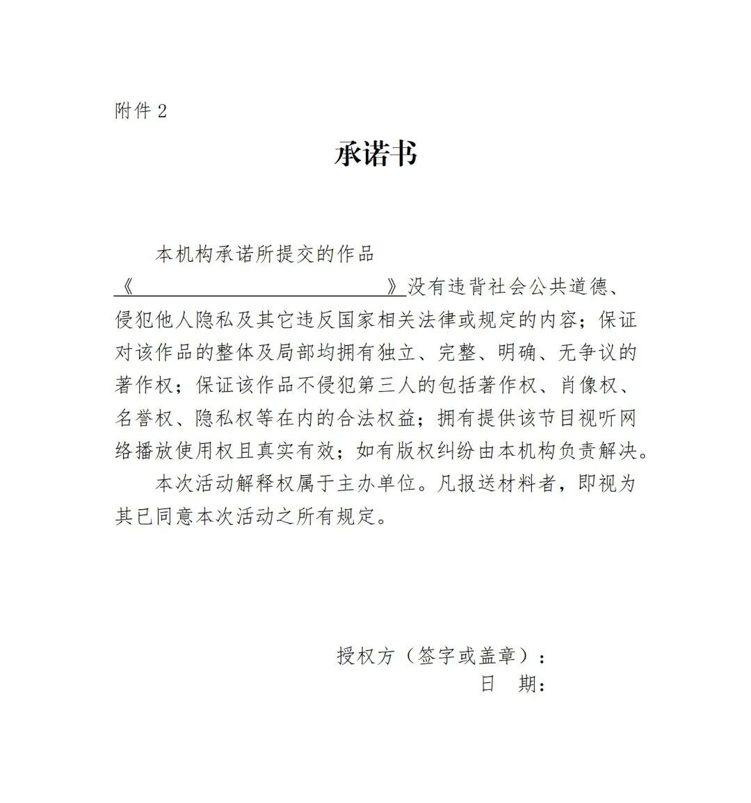 2.主办方将在相关活动中展示入围作品,参加征集活动并在报名表中填报“参与展播”即视为已征得作品版权方授权,如产生与版权等相关法律纠纷,由参与单位及个人负责,与主办方无关。