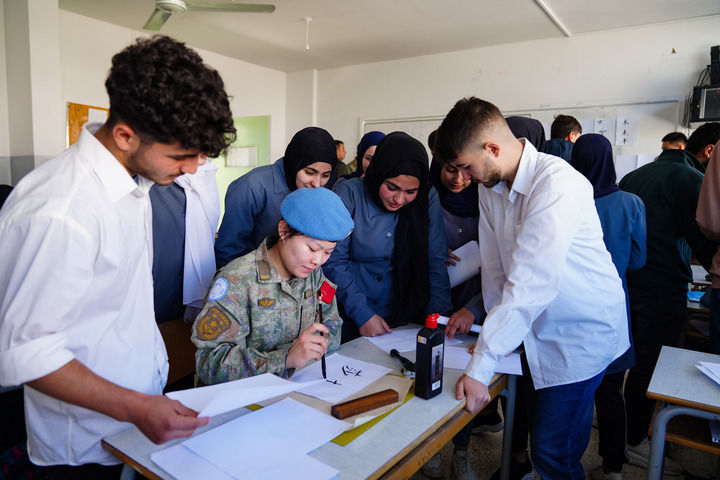 2023年4月3日,中国赴黎巴嫩维和多功能工兵分队维和女兵韦薇在贝鲁特拉赫曼·尤努斯中学用中文书写学生名字。新华社发(李竹林摄)