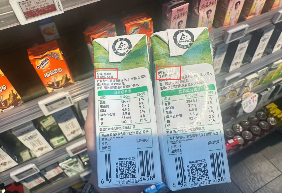 9月上旬,记者走访了北京、成都等部分地区的一些商超,发现货架上的纯牛奶产品的配料表中均无“复原乳”出现,配料表里只有“生牛乳”。