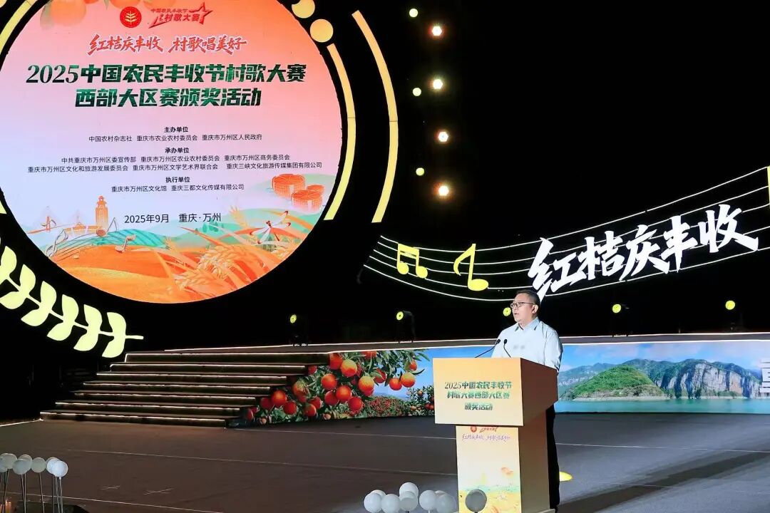 红桔庆丰收、村歌唱美好。9月21日,中国农民丰收节村歌大赛西部大区赛在重庆市万州区成功举办。来自四川、重庆、甘肃、宁夏、新疆、西藏6省(自治区、直辖市)的13支正赛队伍和4支副赛队伍分获西部大区赛一、二、三等奖。21日晚,获奖节目在万州区古红桔产业基地集中展演。