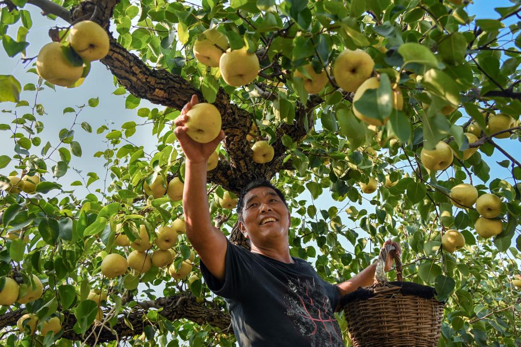 9月15日,在安徽省宿州市砀山县一处梨园内,梨农在采摘酥梨。新华社发(崔猛 摄)