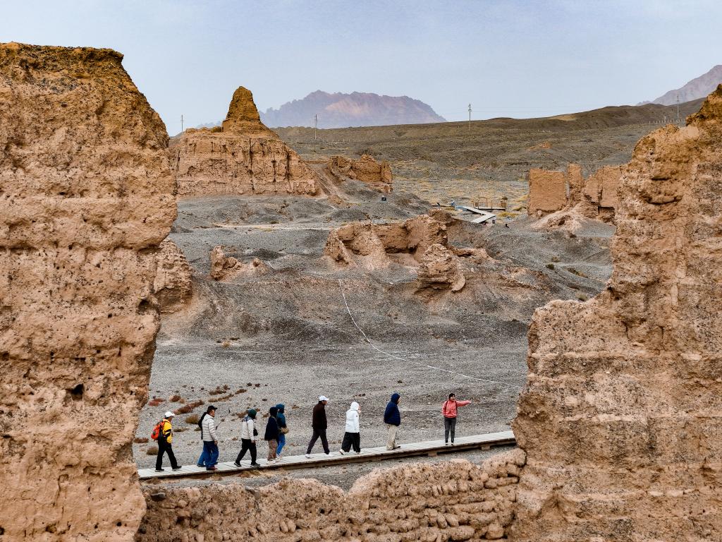 游客在克孜尔尕哈烽燧参观。新华社记者 胡虎虎 摄