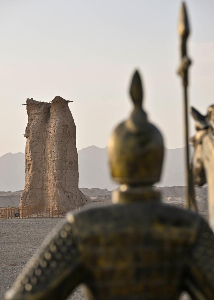 克孜尔尕哈烽燧与兵士塑像相映成趣。新华社记者 胡虎虎 摄