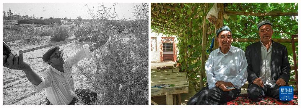 左图:1995年,阿不都在丈量沙漠前沿红柳生长情况;右图:2016年,退休后的阿不都(左)在绿树环抱的庭院里。时任策勒县林业局局长阿不都·热合曼感慨万千:“在风沙面前,策勒人已三度退让,而风沙还在步步紧逼。后面是昆仑山,我们已再无退路;只有奋起向风沙宣战。多年过去,我们终于在不断进逼的黄沙面前站稳了脚跟。”
