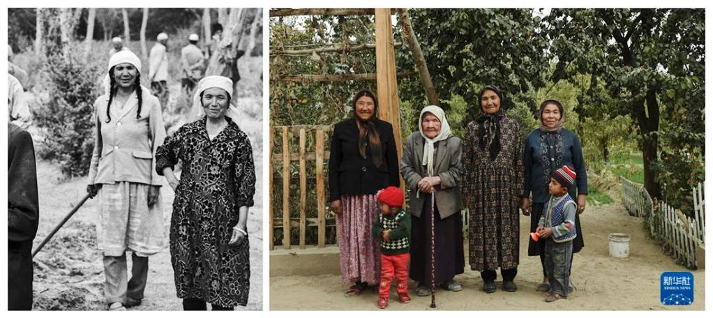 左图:1990年9月,策勒乡托帕村的农民艾尼巴尔汗(中)和乡亲们一起在风沙前沿参加防风治沙劳动,身后的农田和果林,是她们艰辛付出收获的成果;右图:2016年10月,艾尼巴尔汗(左四)和乡亲们在林地前合影。