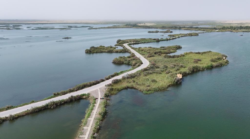 这是2025年8月6日拍摄的拉里昆国家湿地公园。近年来,新疆通过退耕还湿、生态补水、修建沙漠缓冲带等系列修复措施,湿地保护成效显著。新华社记者 周佳谊 摄