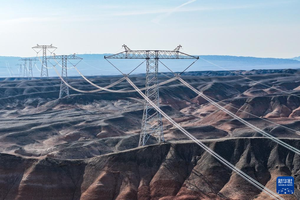 矗立在戈壁上的±800千伏哈密—重庆特高压直流输电线路工程(4月8日摄,无人机照片)。