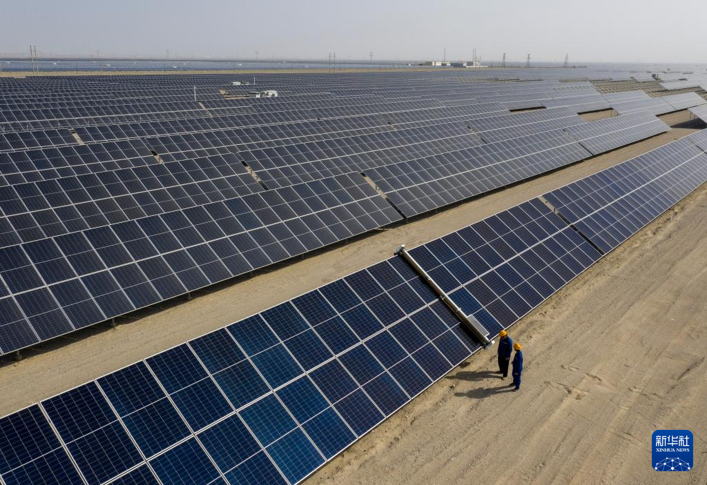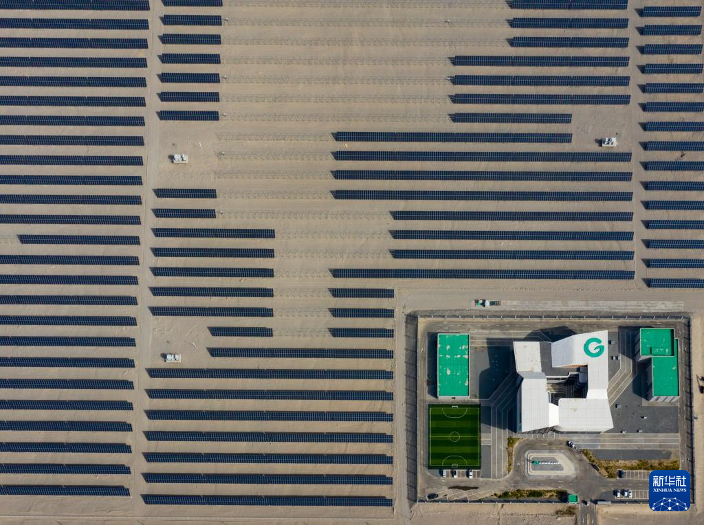 9月22日在新疆巴音郭楞蒙古自治州若羌县拍摄的中国绿发新疆中绿电若羌400万千瓦光伏项目(无人机照片)。该项目每年可发电69.08亿千瓦时,满足南疆200万户家庭用电需求,减排208.24万吨煤耗。