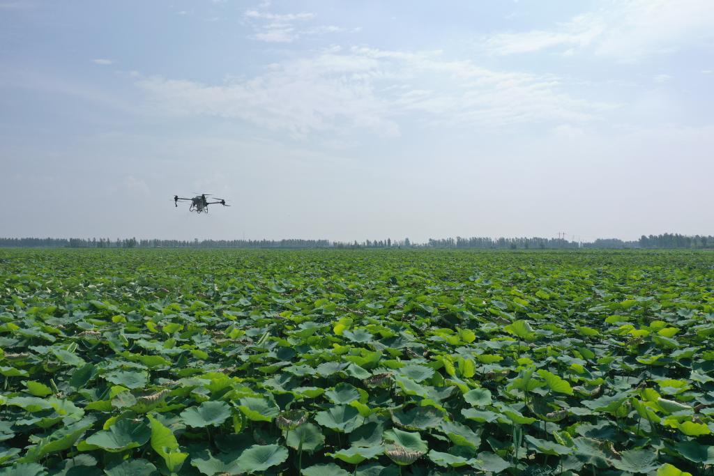 在新河镇白穴口村千亩莲藕种植基地,村民们正用植保无人机对藕塘施肥。种藕大户王庆章边忙活边介绍,水系连通不仅让他们取水方便,水质也很好。