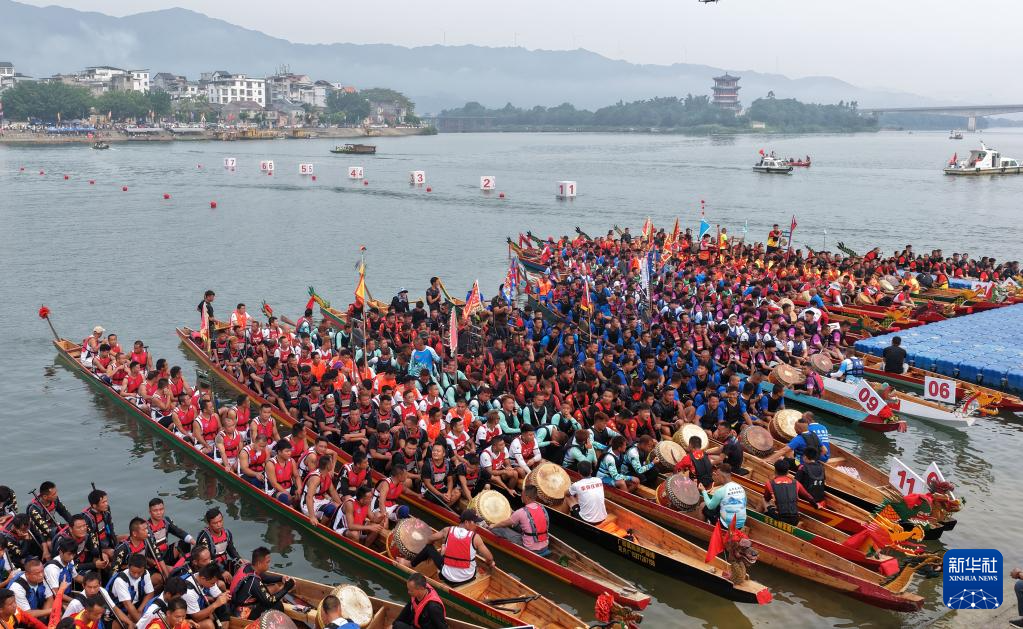 9月30日,在广西柳州市融安县迎国庆龙舟大赛中,参赛队伍在融江河上准备比赛(无人机照片)。