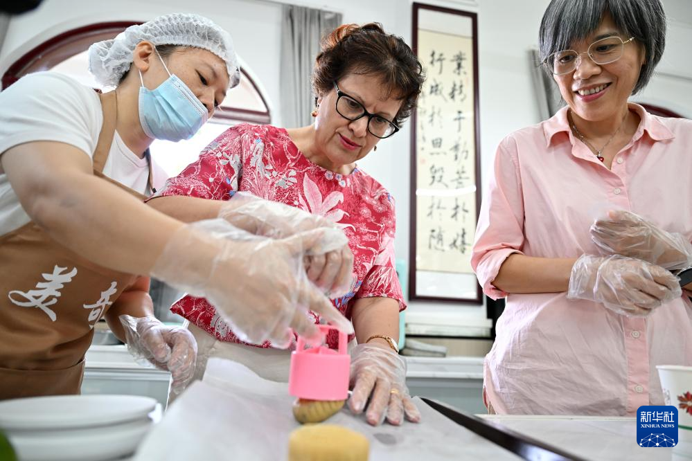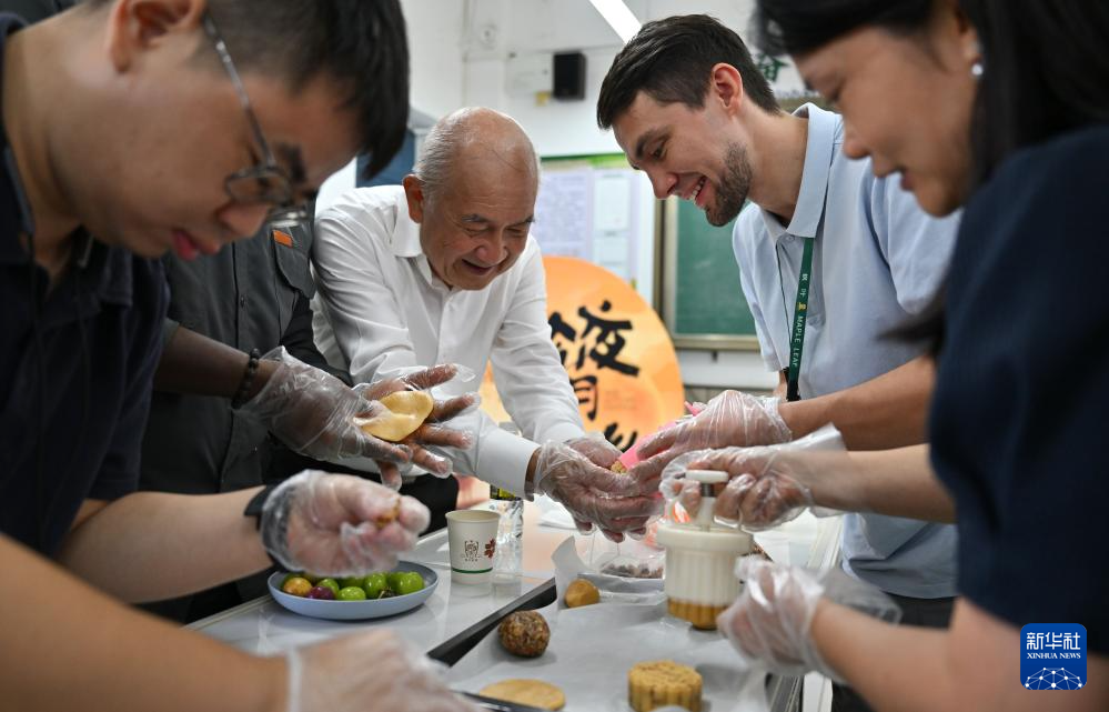 9月30日,在海口市外事办公室举办的中秋文化交流活动中,中外友人在体验月饼制作。