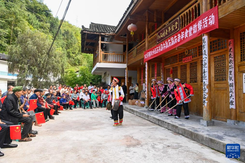 9月28日,在重庆市酉阳土家族苗族自治县楠木乡红庄村老年食堂,艺人为村民表演。