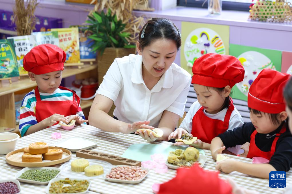 9月29日,河北省石家庄市藁城区通安幼儿园小朋友在老师的指导下学做手工月饼。
