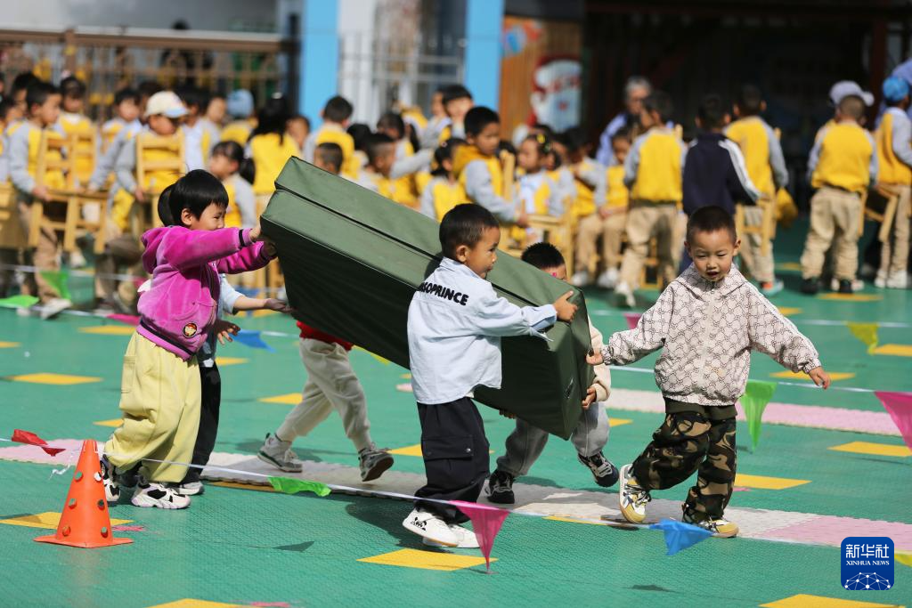 9月29日,甘肃省定西市安定区友谊幼儿园的小朋友在玩接力游戏。
