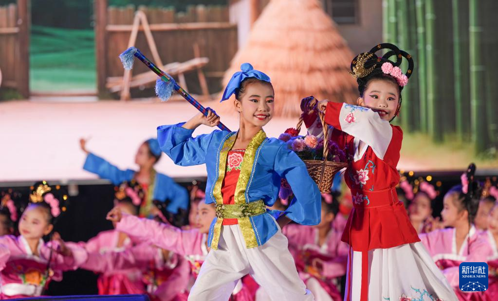 9月29日,山东省邹平市小学生在迎国庆活动中表演黄梅戏《打猪草》。