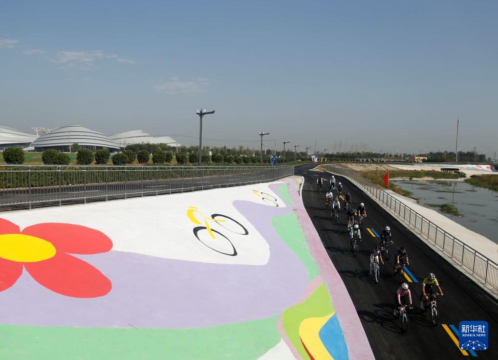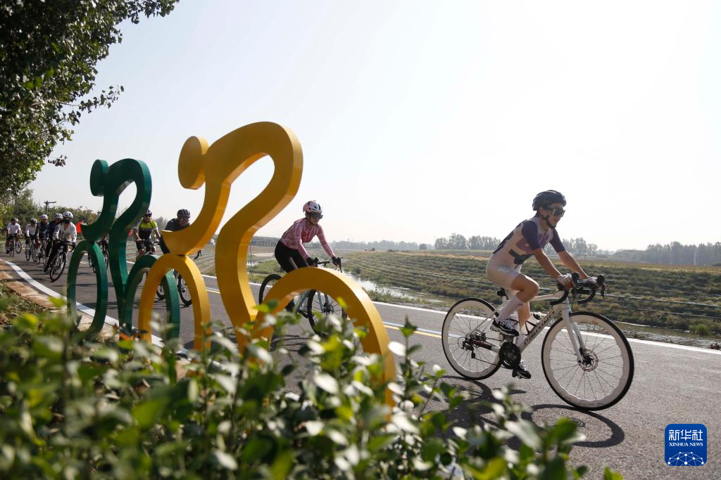9月30日,在河北省邢台市高新区举行的骑行迎国庆活动中,骑行爱好者在祝村镇牛尾河畔骑行。
