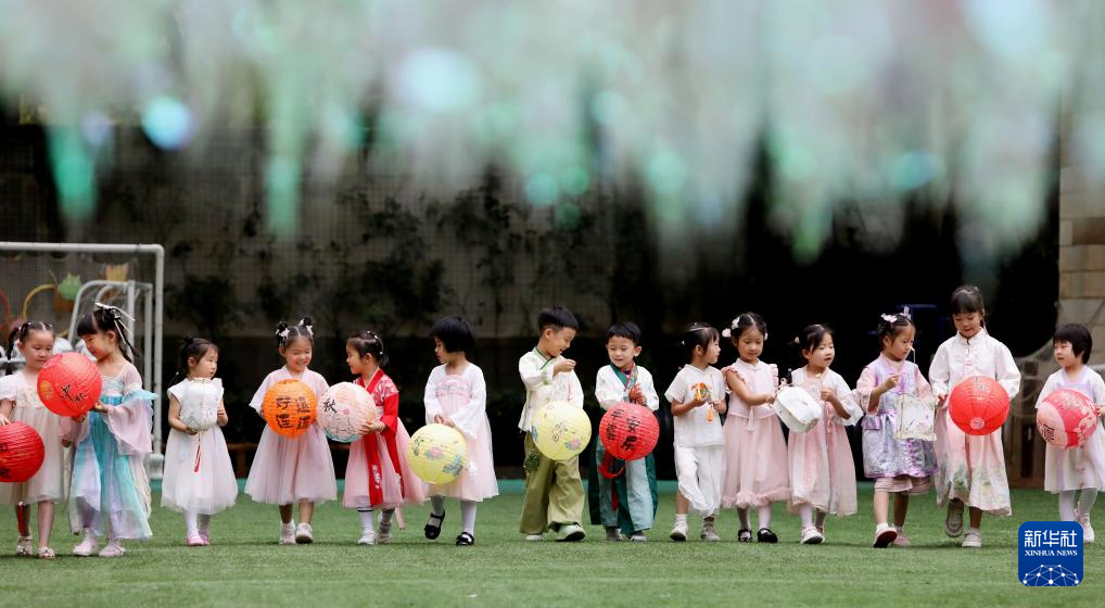 9月30日,江苏苏州高新区实验幼儿园的小朋友手提中秋花灯游园。