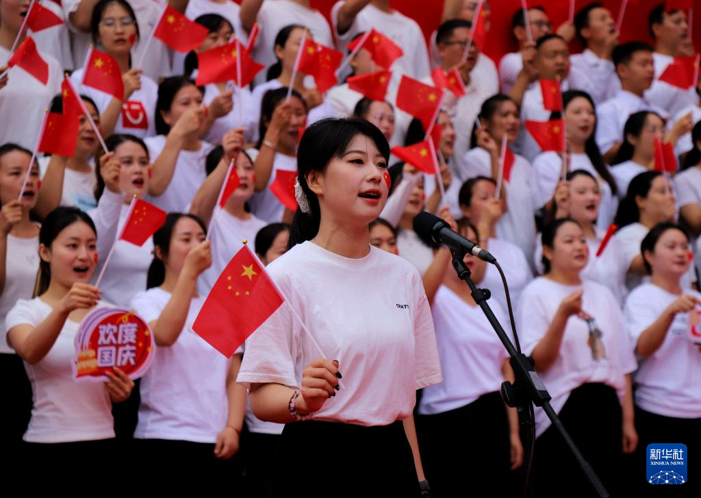 9月30日,在河南省南阳市区万悦城广场,当地群众齐唱歌曲《我和我的祖国》。