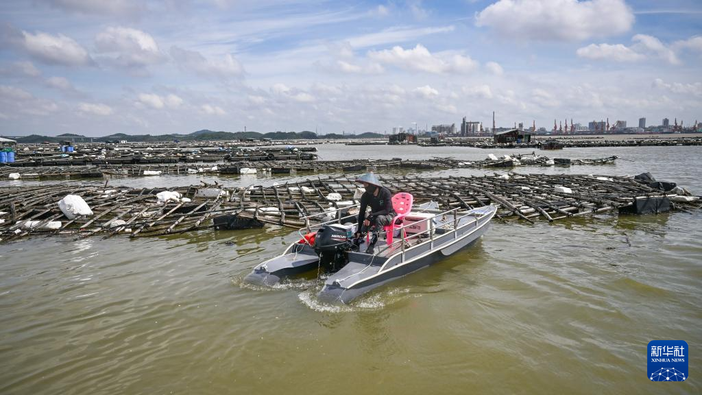 10月7日,钦州市钦南区龙门港镇南村一名村民驾船去修补受损蚝排。