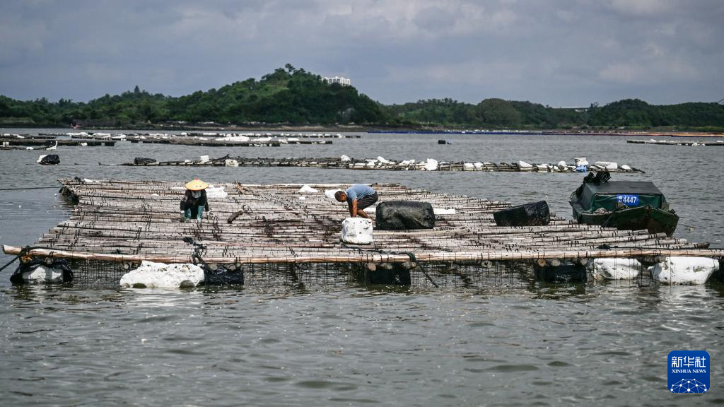 10月7日,钦州市钦南区龙门港镇南村村民在修补受损蚝排。