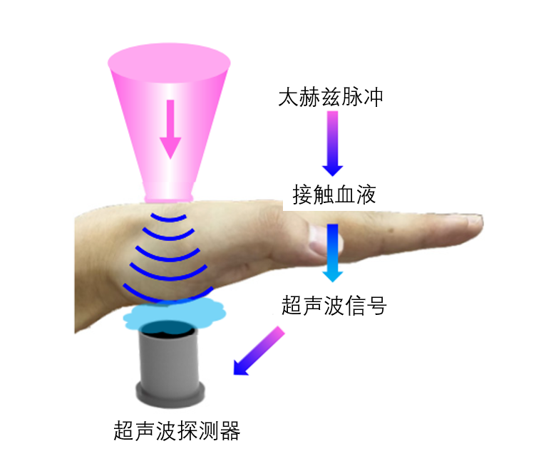 第一步,太赫兹光声系统发射太赫兹脉冲,脉冲一个接一个地穿透组织到达血管,被血管中的水、血糖以及各类离子吸收;第二步,吸收太赫兹能量后,这些物质会发出不同种类的超声波;第三步,太赫兹光声系统中接收超声波的仪器收到超声波后,筛选出钠离子所发出的特定种类超声波,超声波信号的强弱能够反映钠离子含量的多少。