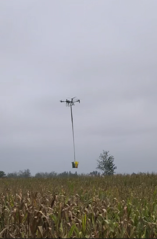 秋雨连绵中,一架架搭载专业吊装设备的无人机掠过金黄玉米田,抓取、转运行云流水。它们精准悬停在玉米秸秆上方,通过机械臂快速抓取成袋玉米,平稳转运至田边。相较于人工搬运,无人机不受积水阻碍,单次可承载数十公斤,一小时便能完成5亩地的转运任务,效率提升近10倍。