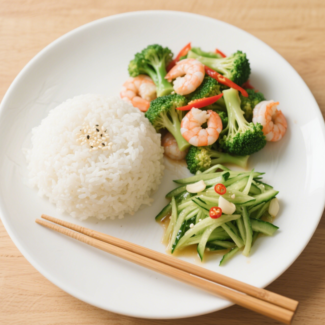 A套餐:米饭一拳半+西兰花炒虾仁+凉拌黄瓜;