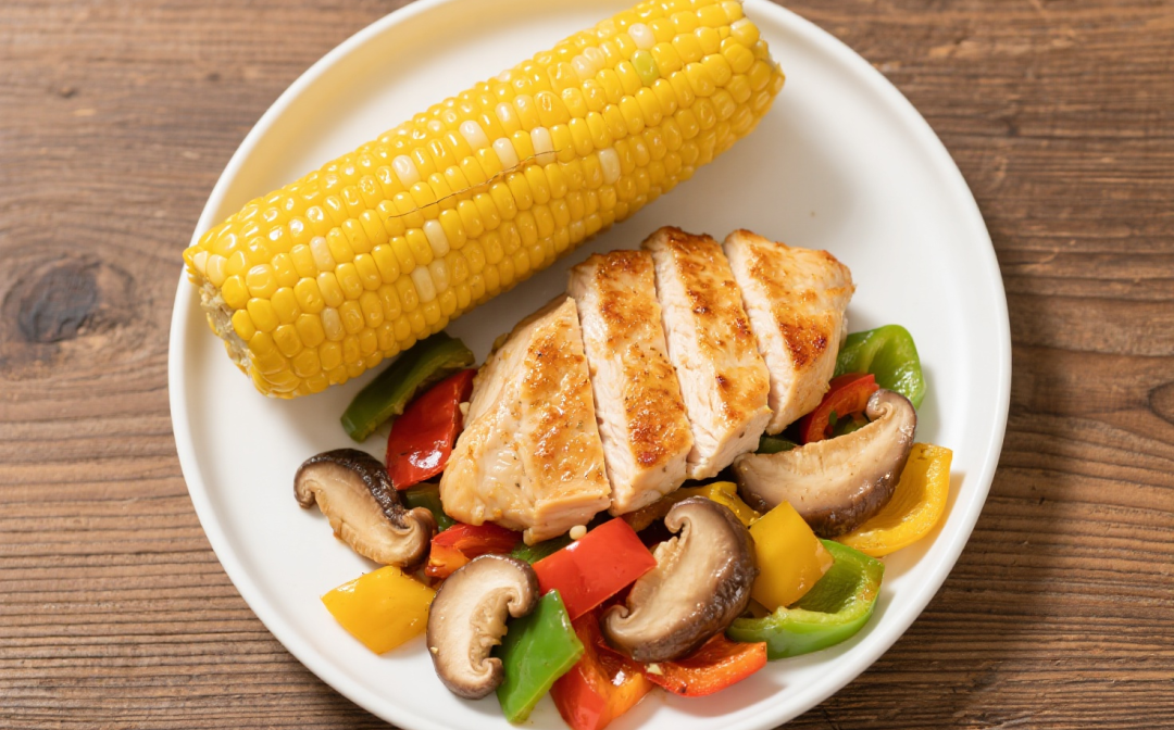 C套餐:玉米一根+煎鸡胸肉+彩椒炒杏鲍菇。