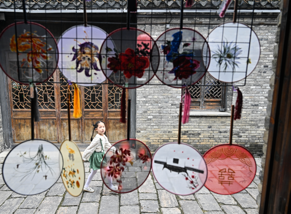 10月1日,小朋友走在盱眙县第一山历史文化街区。新华社记者 季春鹏 摄