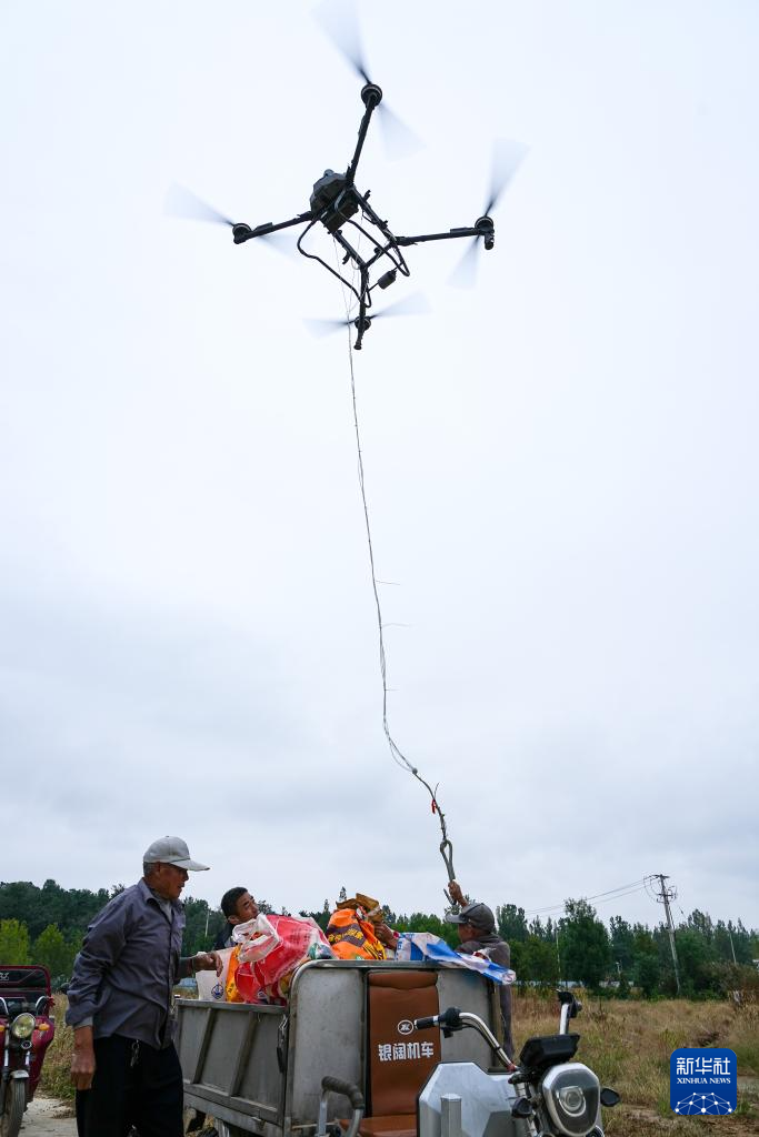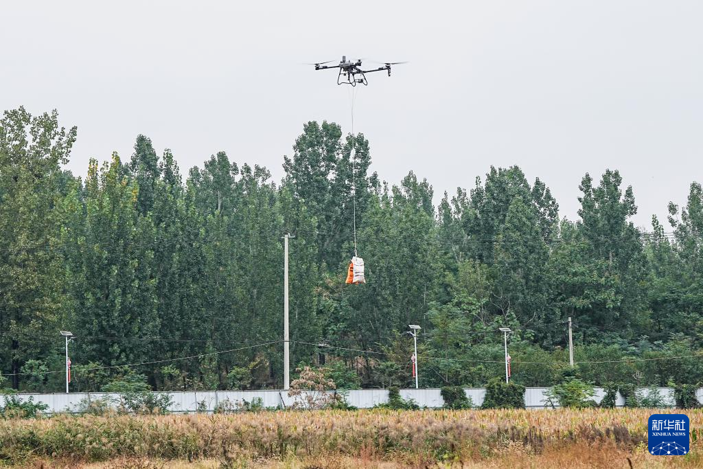 10月11日,沂南县张庄镇种植户用无人机吊运收获的玉米。