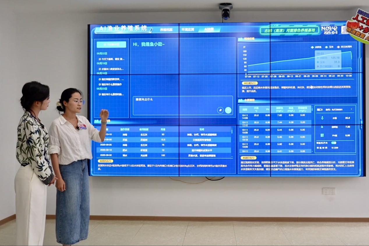 在AI数据中心,智慧养殖的“最强大脑”正在精准运转。大屏幕上,温度、溶氧量等30多项数据实时跳动,“溶氧量低于5mg/L自动预警,pH值波动超0.3立即报警。”技术员演示着智能预警系统。核心的AI助手“渔小助”更将专家经验数字化:输入“连续高温怎么办”,系统即刻生成增氧、调水、控饵全套方案,让新手也能精准管理。