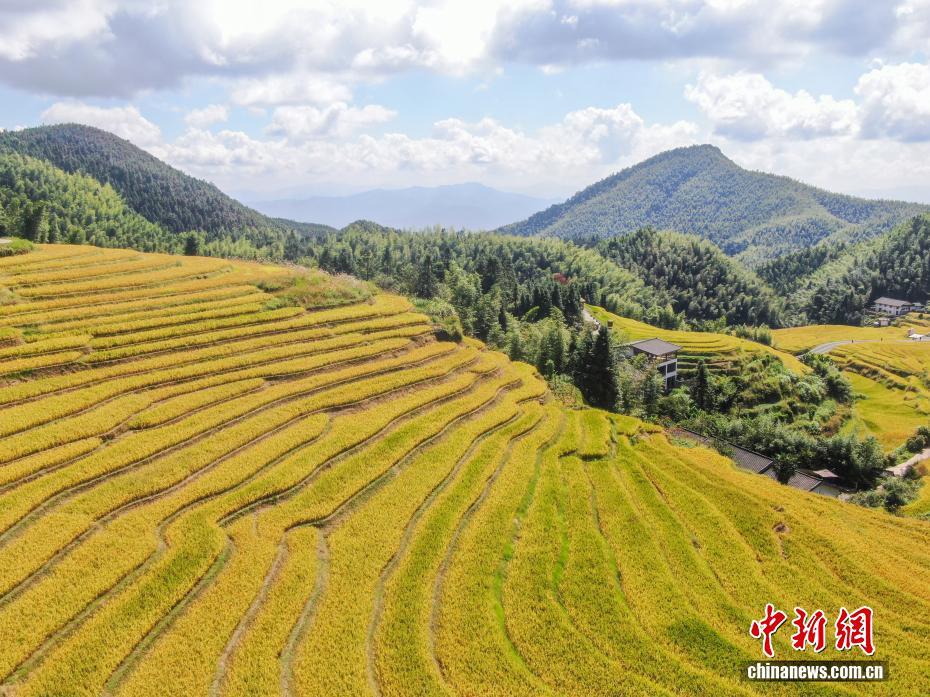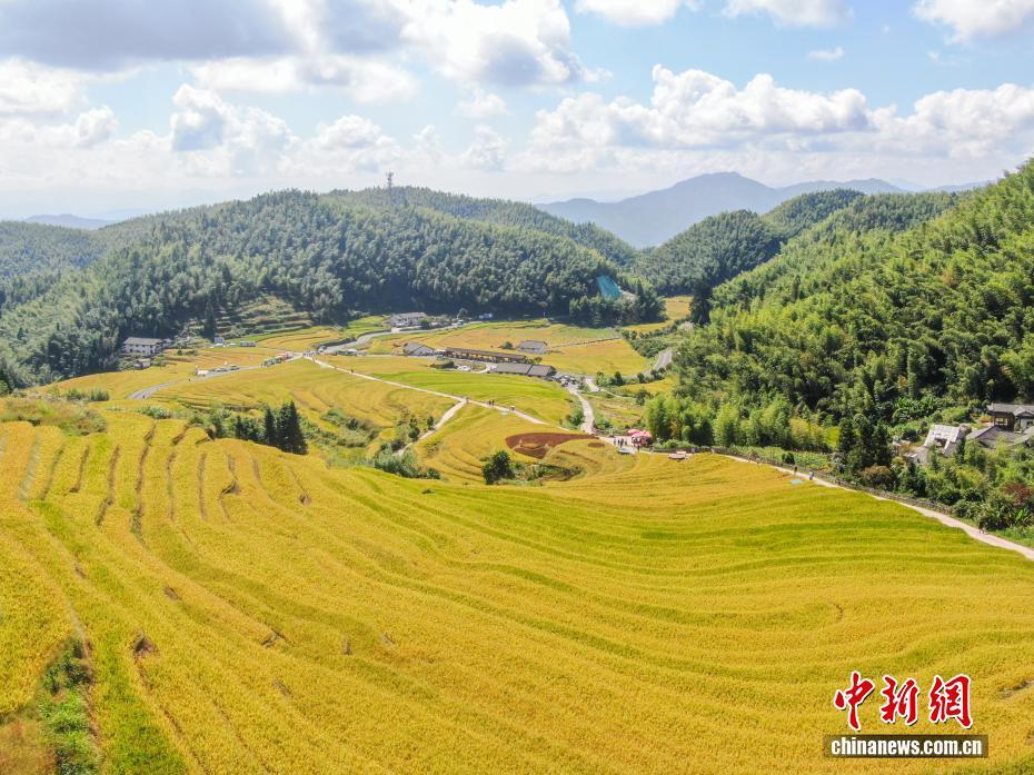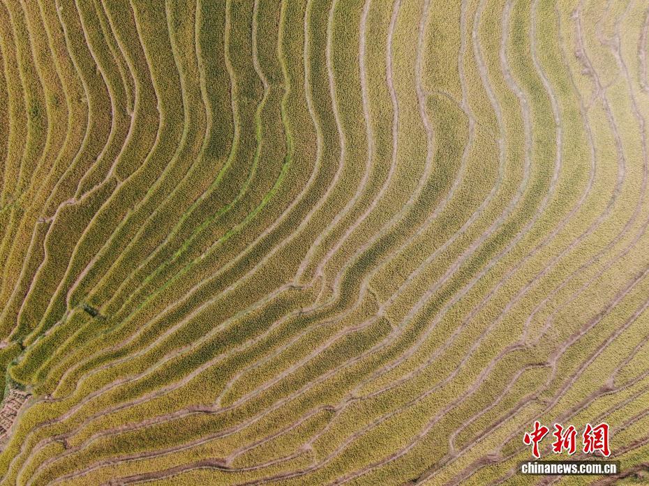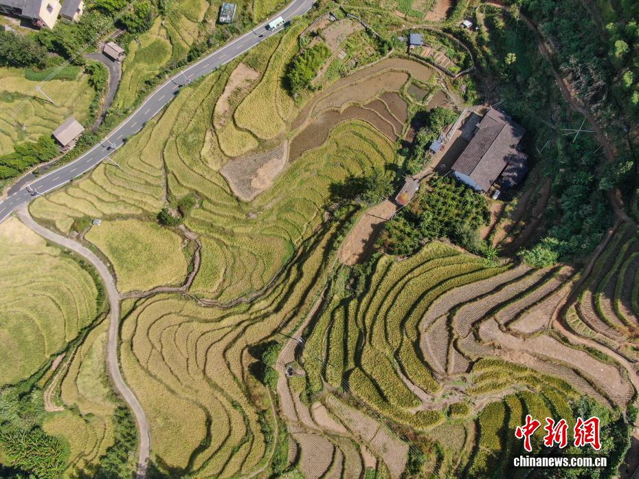 10月16日,世界粮食日,航拍位于江西赣州崇义县的上堡梯田,秋收时节,金色稻浪翻滚,“丰”景美如画。上堡梯田位于大山深处,总面积逾5万亩,被誉为“世界最大客家梯田”,梯田成片相连、错落有致地分布在高高低低的山岭上,海拔垂直落差近千米,最多处达62梯层。2018年,上堡梯田被联合国粮农组织认定为“全球重要农业文化遗产”;2022年,上堡梯田入选“世界灌溉工程遗产名录”。(无人机照片)中新社记者 刘力鑫 摄