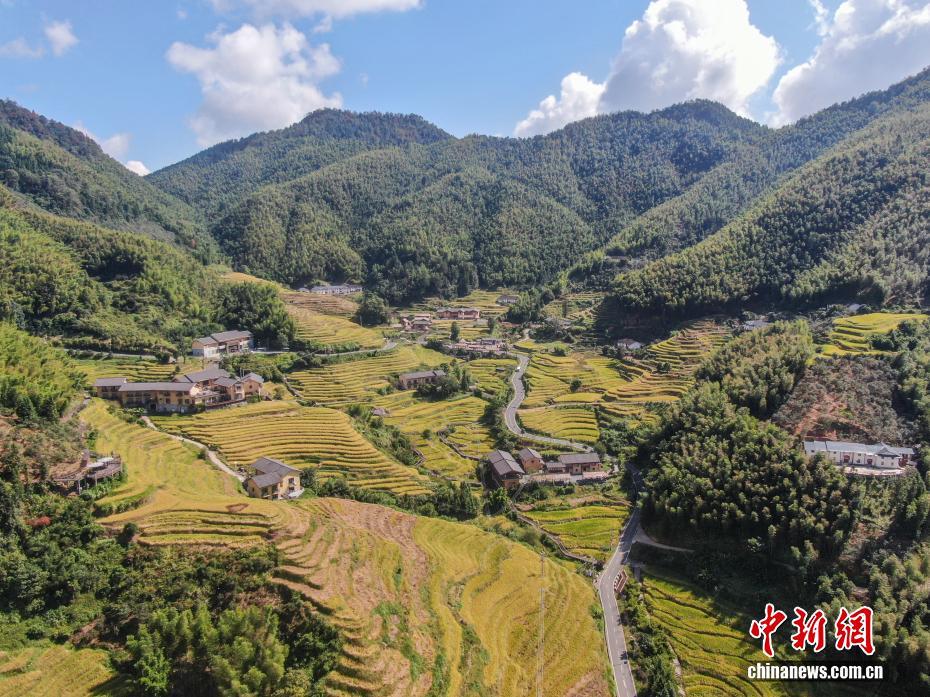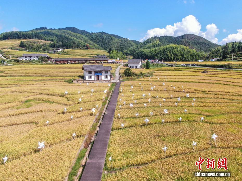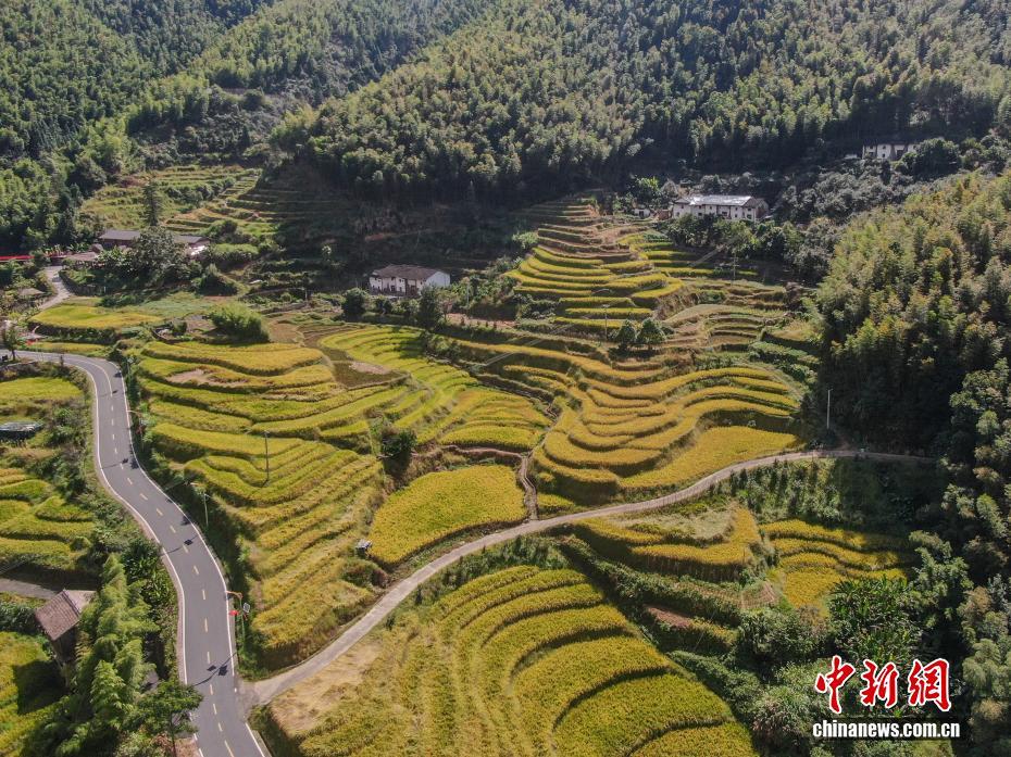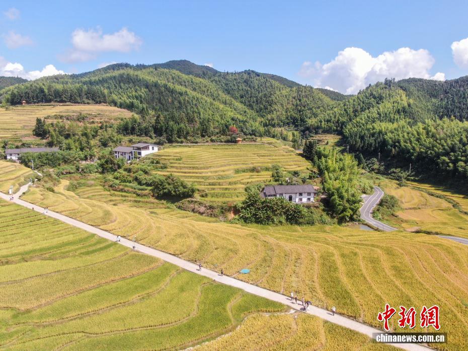 10月16日,世界粮食日,航拍位于江西赣州崇义县的上堡梯田,秋收时节,金色稻浪翻滚,游客漫步其中观光游玩。上堡梯田位于大山深处,总面积逾5万亩,被誉为“世界最大客家梯田”,梯田成片相连、错落有致地分布在高高低低的山岭上,海拔垂直落差近千米,最多处达62梯层。2018年,上堡梯田被联合国粮农组织认定为“全球重要农业文化遗产”;2022年,上堡梯田入选“世界灌溉工程遗产名录”。(无人机照片)中新社记者 刘力鑫 摄
